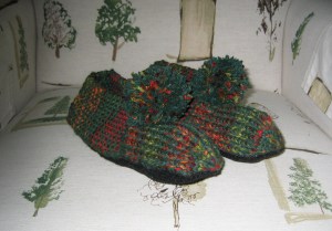 I did it! I finished the slippers in record time. And sewed on the soles. And made pom poms.