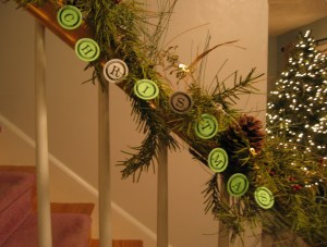 The circles are glued back-to-back with black thread in between for some toddler-proof garland. It’s made so if the circles flip over, the letters are still the right way. Our tree has so many lights on it that I couldn’t get a picture with the garland on the tree so I tried it on the banister.