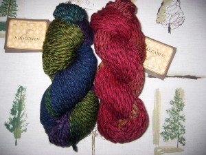 The red one didn’t have the depth of color I wanted but I didn’t know that until I took the hank apart to roll into a ball. (side note: I don’t have a ball winder. I prefer to do that myself. Really.) The red was dull. Anyway, I put it back into the twisted configuration as I intend to exchange this for something else. It was a little too pricy to keep in my stash.