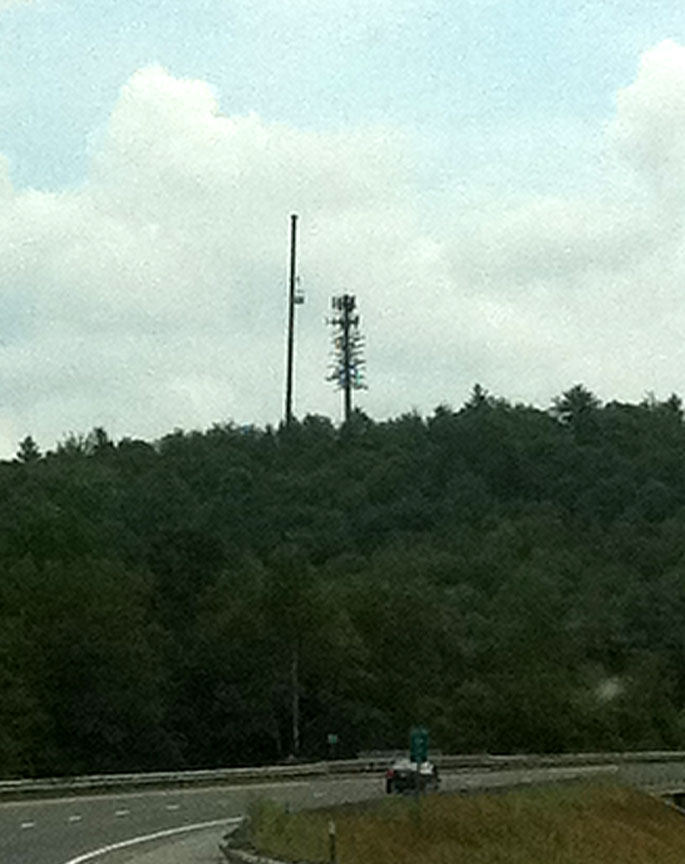 This is a New Hampshire cell phone tower being disguised to look like a pine tree. A very tall pine tree.
