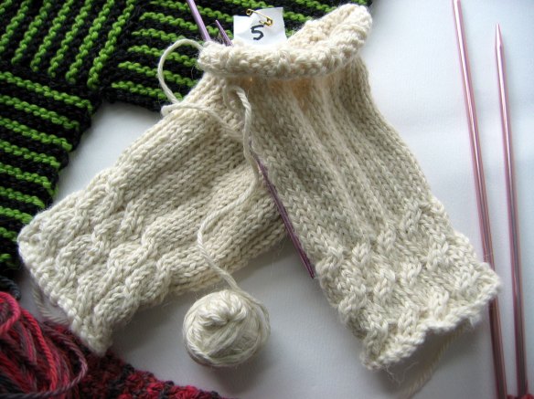 I don’t like the way theses mitts flare out and curl at the ends which is why they are still unfinished. I will rip out the finger and thumb edges and finish them with a simple ribbing.