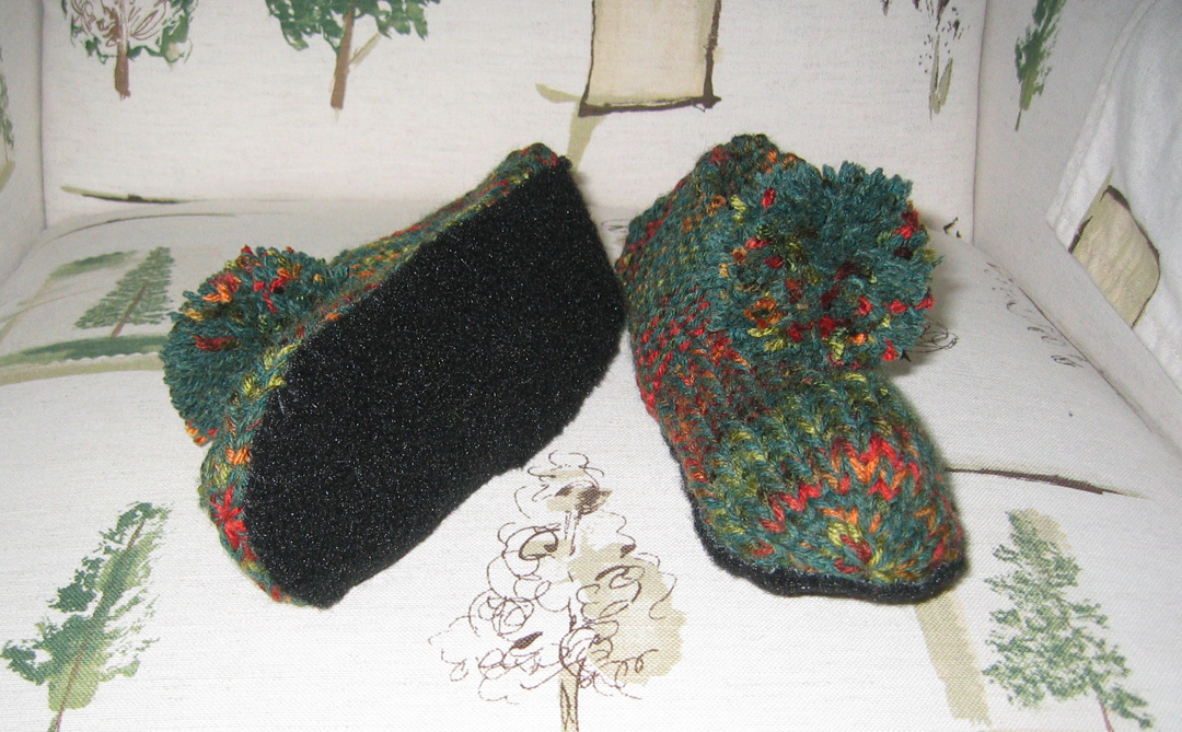 1. They look great. I’m a novice knitter and am making a pair of garte stitch fingerless gloves but it’s thick wool and heavy going. They are supposed to be able to be completed in an evening! I really want to knit myself a pair of these kind of slippers but am failing to find a very easy pattern without too much increasing etc or knitting in the round.