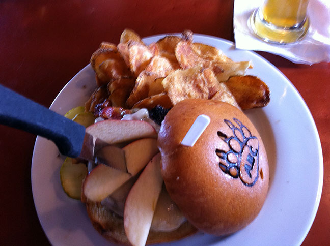 Sasquatch Burger topped with brown sugar caramelized applewood smoked bacon, caramelized onions, apple slices, and Provolone (my choice) cheese also served on a toasted brioche bun.