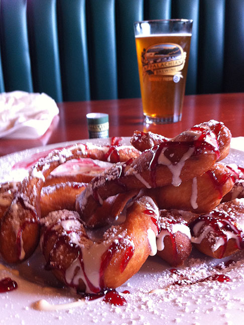 Zeppole for dessert: Deep-fried dough sprinkled with confectioner’s sugar and drizzled with raspberry vanilla sauce. Yum!