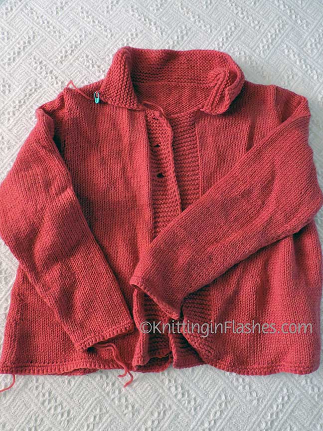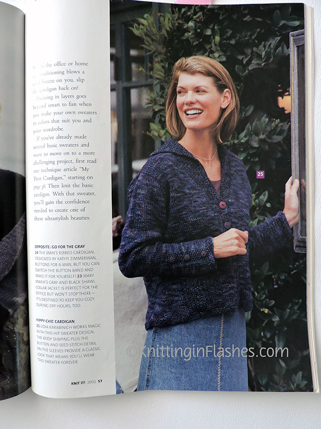 Next up: the Hippy Chic Cardigan: I loved this sweater (at the time) from Knit It! 2002 and couldn’t get gauge but I started knitting it way, way back before I started blogging. Disaster from the get-go.