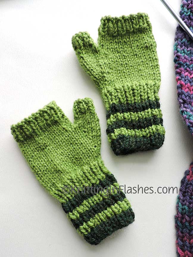 The mitts are for my grandson using the same beginning as the felted mittens. Both yarns are machine washable. Lime green is Cleckheaton Country 8 ply yarn, 100% washable wool and the dark green is the same as the mittens, Lionbrand Wool-eze.