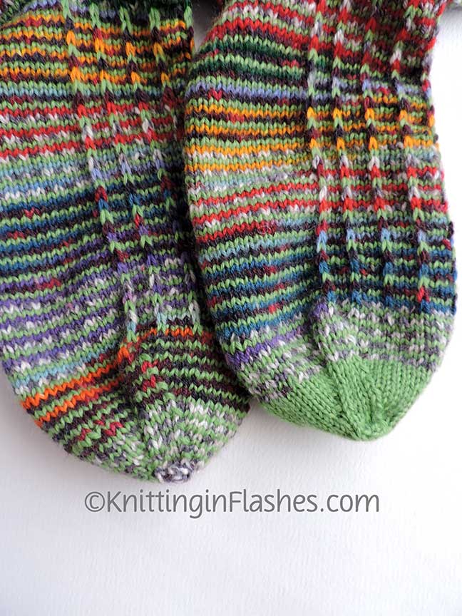 I tried to alternate the red/white/black and the peapod yarn to the tip of the toe.  You can see on one of the socks that I ran out before the end of the toe and just used the peapod to finish it.