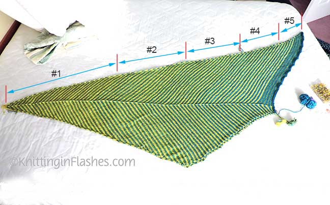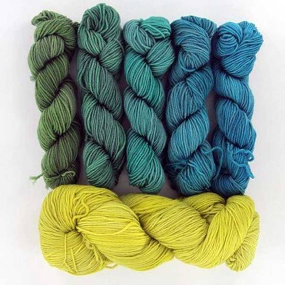 The Which Way shawl pattern was written for this Wonderland Yarns Mad Hatter kit of five gradients plus one. This is the Little Busy Bee and Lime to Turquoise kit. I LOVE all the colors!