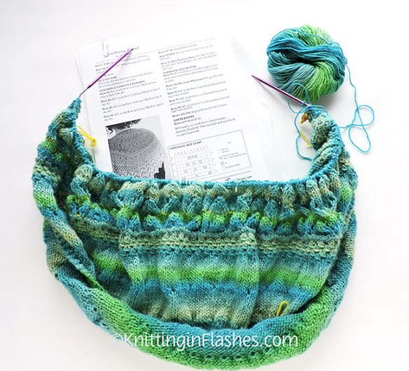 So my plan is to put in a lifeline at the end of this last lace row and see if I can get another horseshoe lace repeat before I run out of yarn.  If I don’t, then I can just rip back to the lifeline and continue with the three-row garter stitch and bind off.
