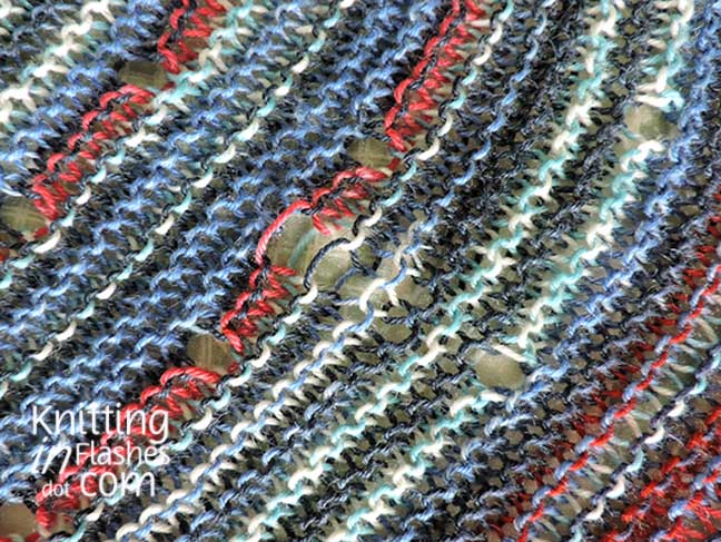 I might tink it back to the eyelet row (which includes the dropped stitch) and begin adding the coordinating yarns earlier since I already know I won’t have enough. They would blend in better.