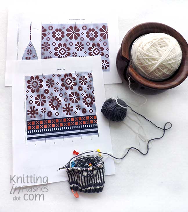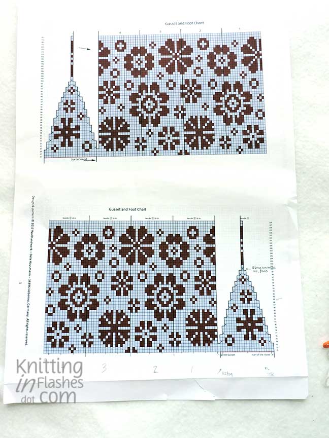Sometimes printed patterns look fine as they are and sometimes better when mirrored. I decided to make my Bloomin’ socks mirror images and printed the charts in reverse.