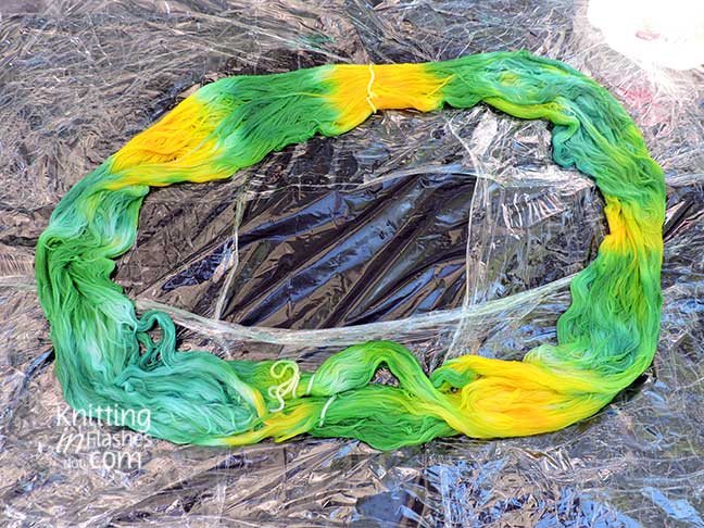 The dye was not placed in even sections around the oval on purpose.  It took a lot of rinsing to get the water to run clear.blue, green, yellow hand-painted yarn