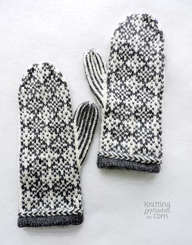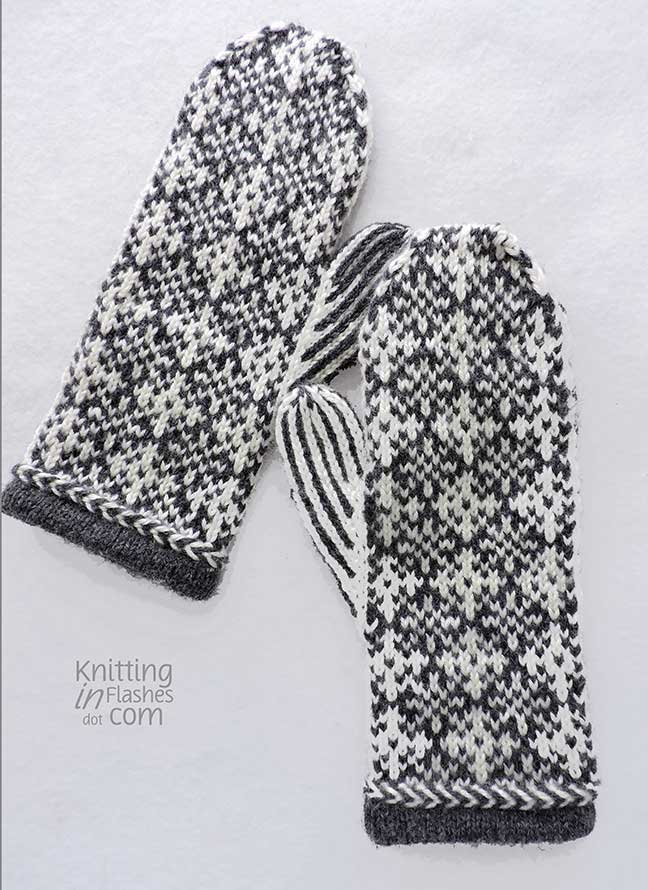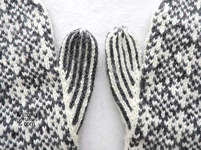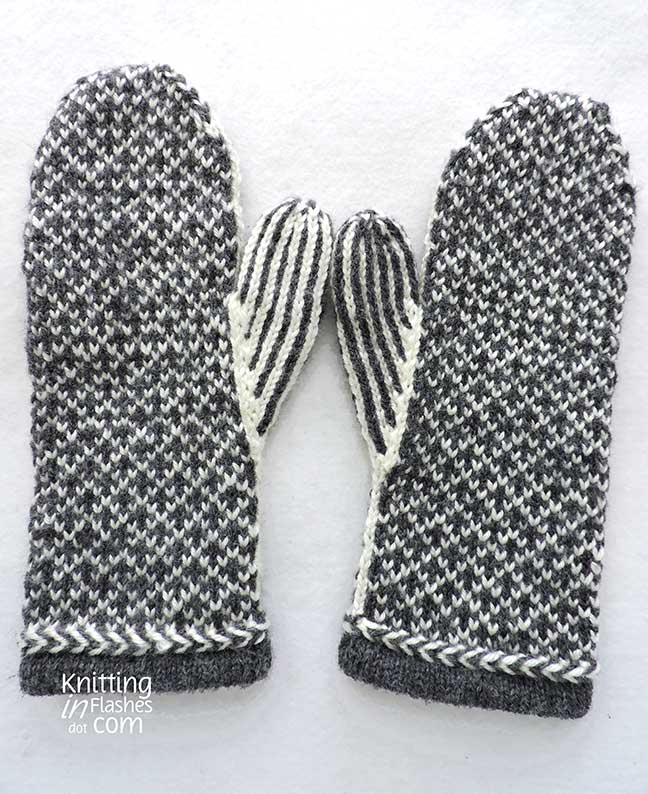 It’s all about which yarn is held above and which is held below as to the color that is more dominant. The ivory yarn was held below the charcoal when I knit the right thumb so the ivory is more dominant. The charcoal yarn was below the ivory on the left thumb.