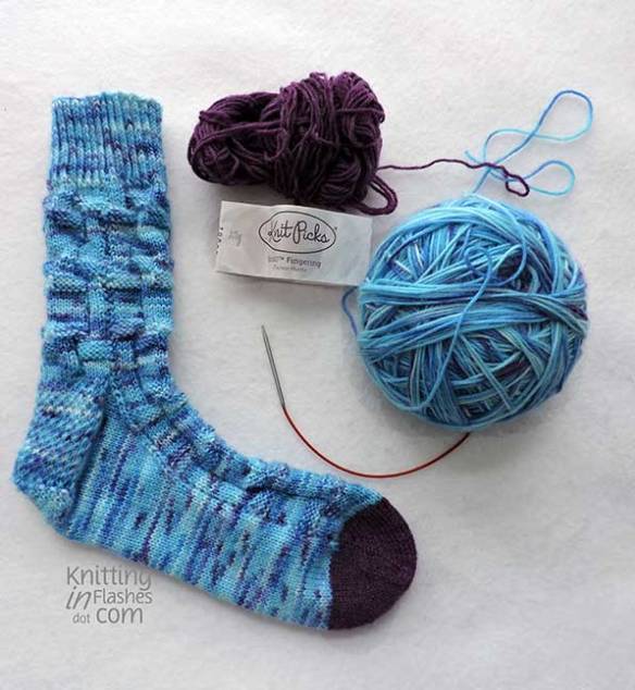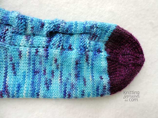 I decided to save a couple of grams of my hand-dyed yarn and use a solid (Knit Picks Stroll in Duchess Heather) for the toes. The purple in the KP yarn is almost an exact match to the purple in the blueberry yarn though it doesn’t look like it in the photos.