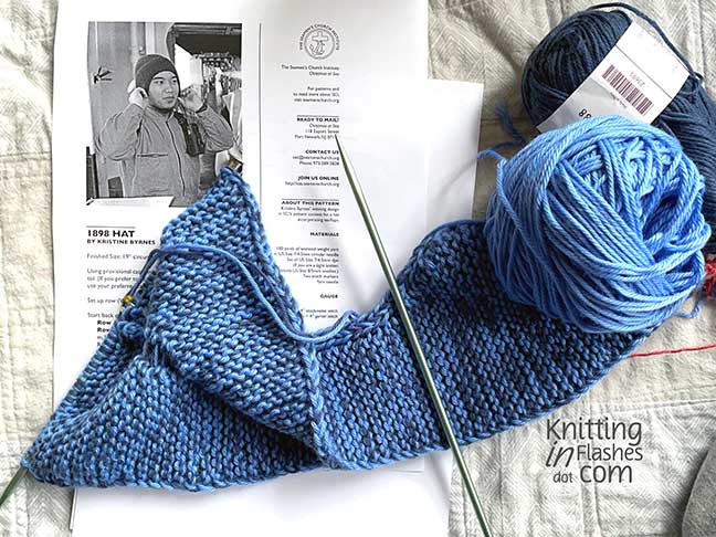 Mr. Aitch has misplaced his hand-dyed, hand-knit 1898 hat I knit for him several years ago. I wanted this to be in the blue range as that’s his favorite color. I didn’t have the right worsted-weight yarn so I’m holding a DK weight together with a fingering weight yarn to get the right thickness. I’m also using a US# 8 needle instead of the #7 called for in the pattern as it should be a better fit for him.