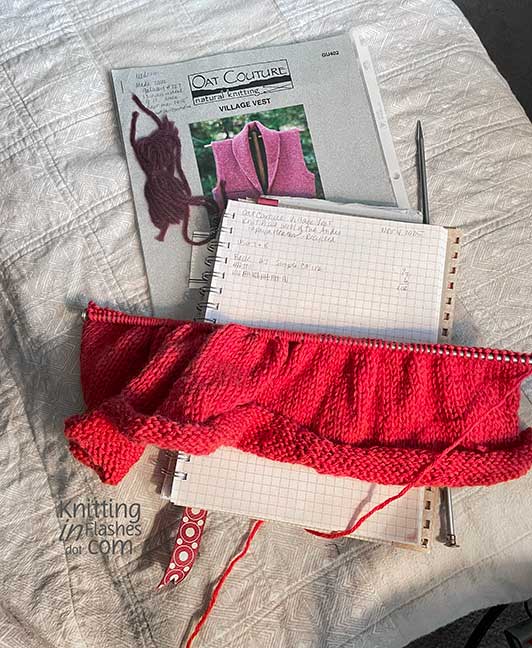 I started knitting this Oat Couture Village Vest for me with yarn I frogged from another project. This pattern was released in 1996 and I knit it way back in 2002. I like it because it buttons rather than pulls over my head.