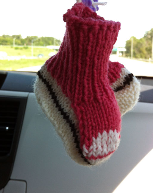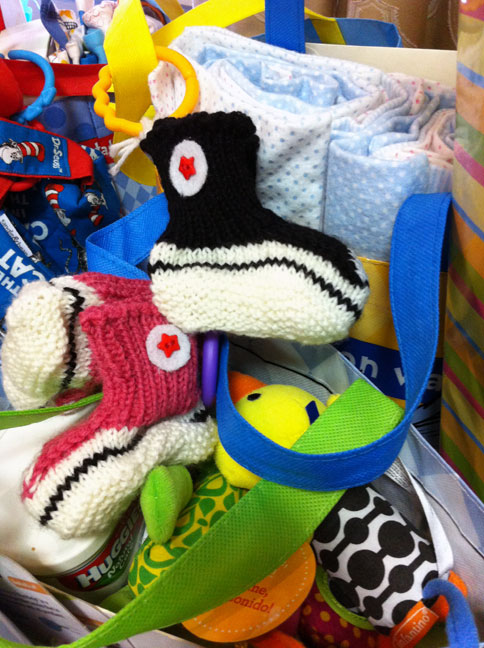 The groom, ushers, and the rest of the men in Alicia’s wedding wore Converse shoes so I knit Converse booties, one in black and one in pink. I adapted three different patterns to suit my patience level and ended up doing a duplicate stitch for the toe part. I did not do laces as IMHO parents of newborns (let alone twins) don’t have time to mess with laces. I found some star button and sewed them on a white disk of iron-on batting. As usual, I ran out of time and was knitting in the car on the way to the shower. But I got them finished in time.