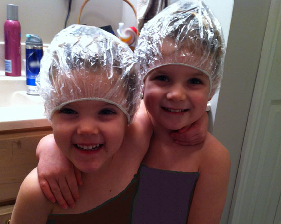 Tonight they took a shower. They love to take a shower in our bathroom but I didn’t want them to get their hair wet tonight so they wore some shower caps I picked up from some hotels where I’ve stayed. They thought wearing shower caps was the BEST thing ever!