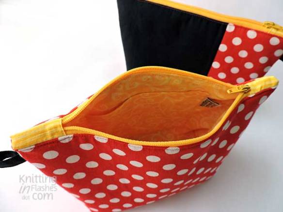 The bright yellow zipper and lining really brighten up the inside. The zippers are from stash and were an inch too short. The yellow fabric ends on the zippers helped stretch them out and made them work. Did you notice my sewn-in tag inside next to the pocket?