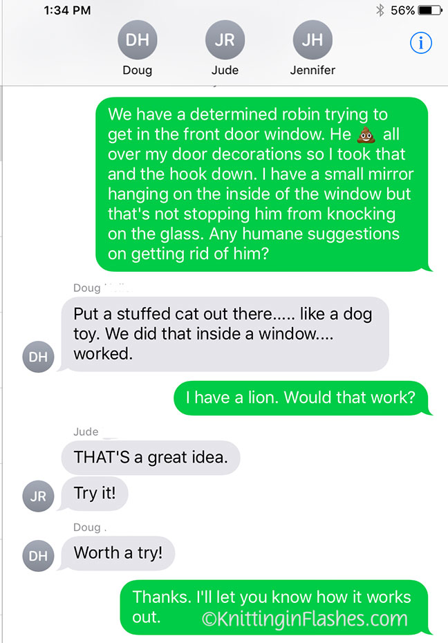 First, the robin would knock on the front door. Then go to the door to the deck and do the “shave-and-a-hair-cut two-bits” rapping. It was driving Mr. Aitch crazy!