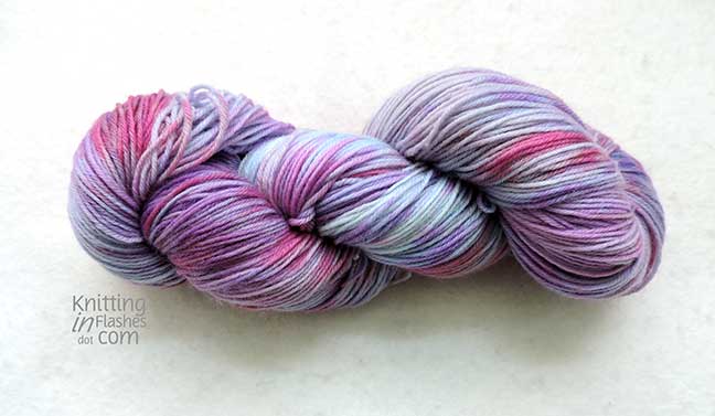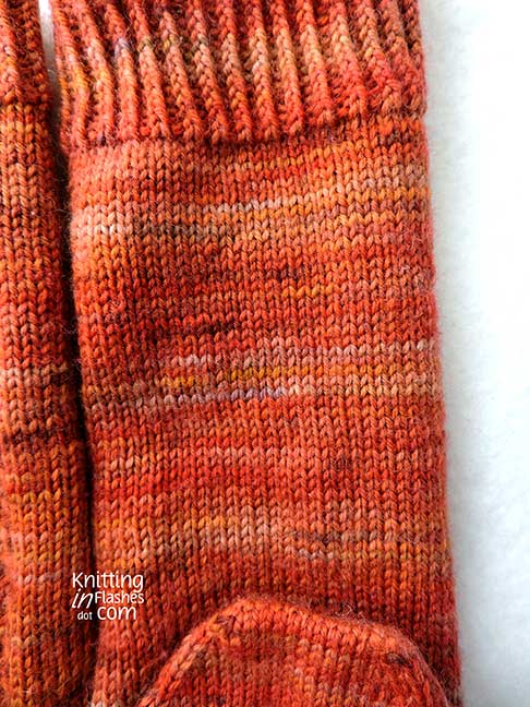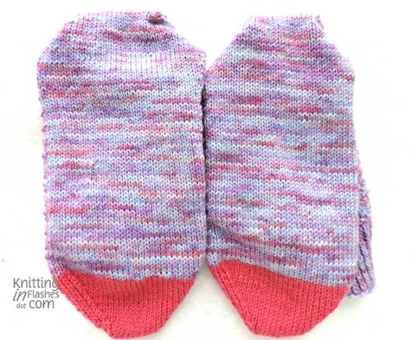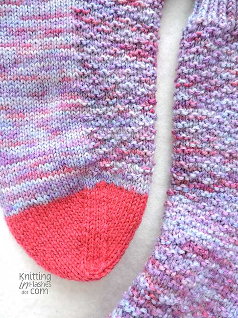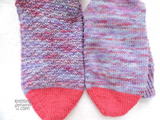 I love how the purple broke into blue and pale red. I like both the double moss stitch texture as well as the plain knit sole.