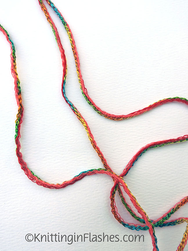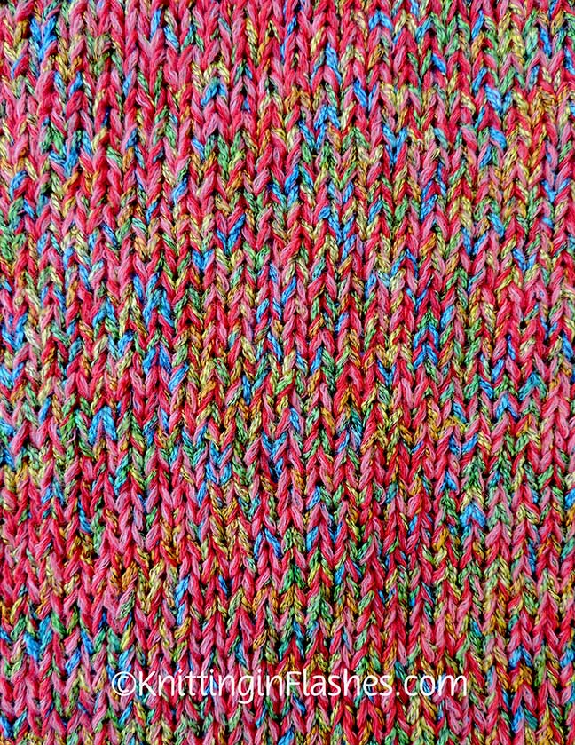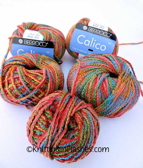 This cotton/acrylic/nylon blend yarn, an Aran weight, is Calico in color 1829. Unfortunately it’s discontinued now but I checked on Ravelry and several people still have some in their stash, too. I know I bought it on sale years ago with no idea of a project what-so-ever. I just liked it. Eight balls of 90 yards isn’t enough to make much but that’s all that was available. The matte red and coral colors are on one side of the strand and the shiny blue, green, gold and orange colors run down the other side so when it’s knitted up, the yarn twists and makes an interesting fabric.