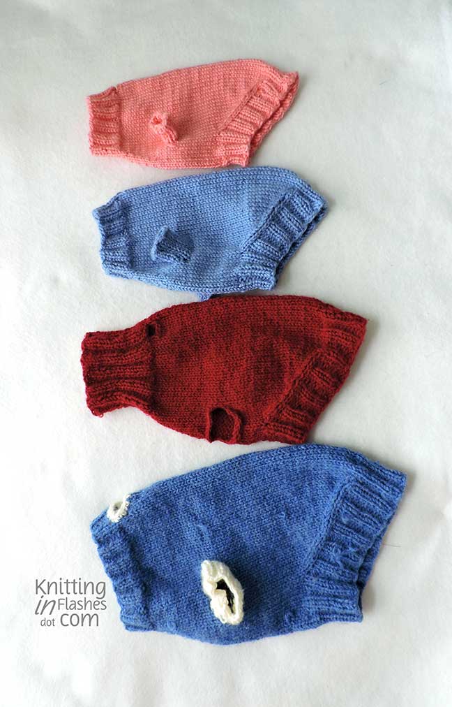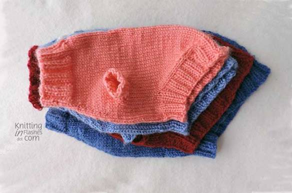 I used the same pattern and size (small) for the top three only changing the needle sizes to get the three sizes shown. For the pink a US #4 needle, the light blue a US #6, and the red a US #8, which is what the pattern called for. I added a hole between the ribbing and body of the sweater to allow for the leash to clip onto her collar and still keep her neck covered.