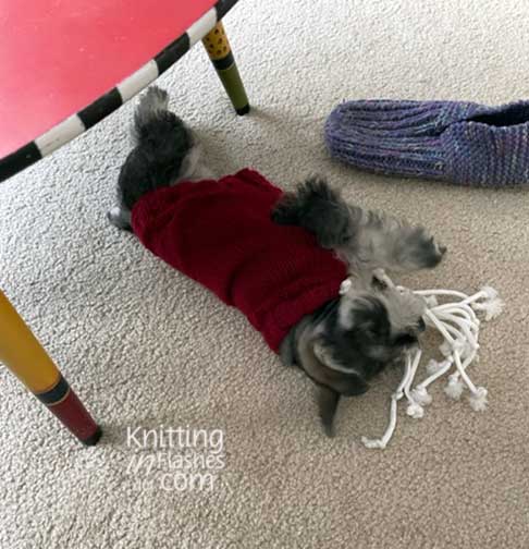 As you can see, she pulled on the sweater and snagged it in several places. It does the job of keeping her warm on the coldest days. Eventually, she will appreciate my knitting skills and desire to keep her warm in the winter months and not put up such a fuss getting dressed to go outside.