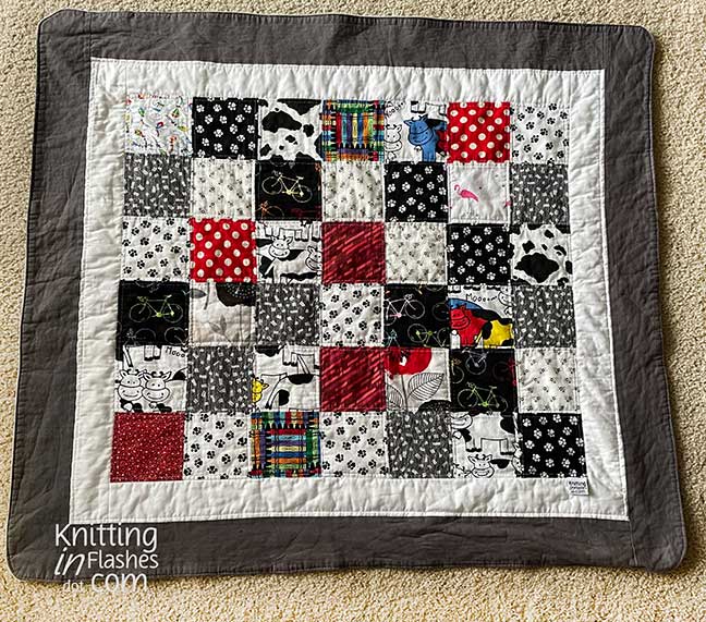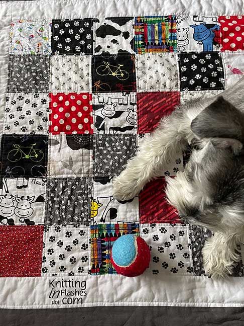 First up: I finally finished a puppy sized quilt for our Mini-schnauzer Pepper. I used leftover scraps of fabric in reds, blacks, and whites. I tried to go with an animal theme so I had some paw-prints, cows, and one flamingo fabrics along with flowers, some kites, polka dots, and miscellaneous red, black, and white prints.