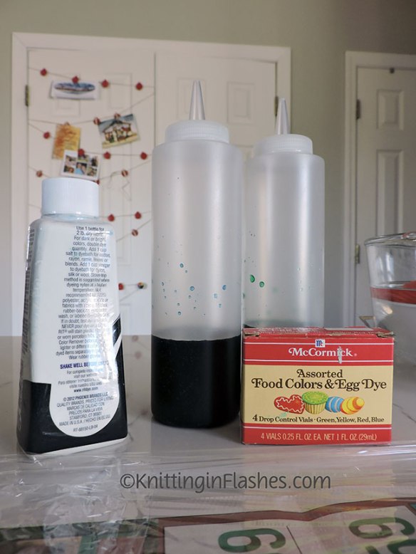I added some leftover Rit dye, a mixture of blue and black, from another project. The blue and green food coloring just wasn’t covering that bright coral color.