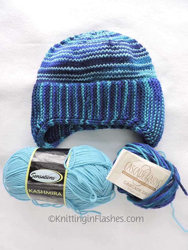 I ripped the crown apart and tried to knit with both ends to get rid of the pooling but I was not successful. I had a similar solid light blue in my stash so I randomly knit a row here and there to break it up.