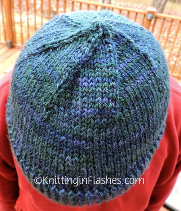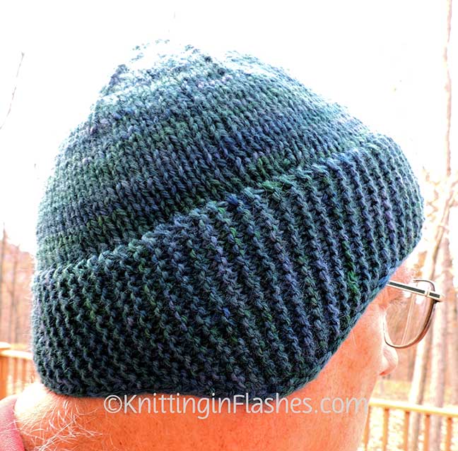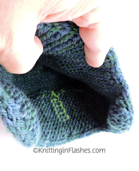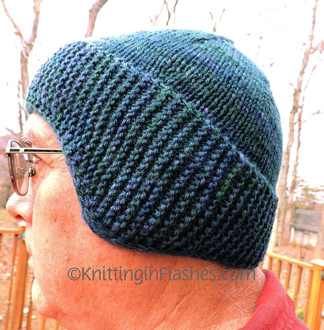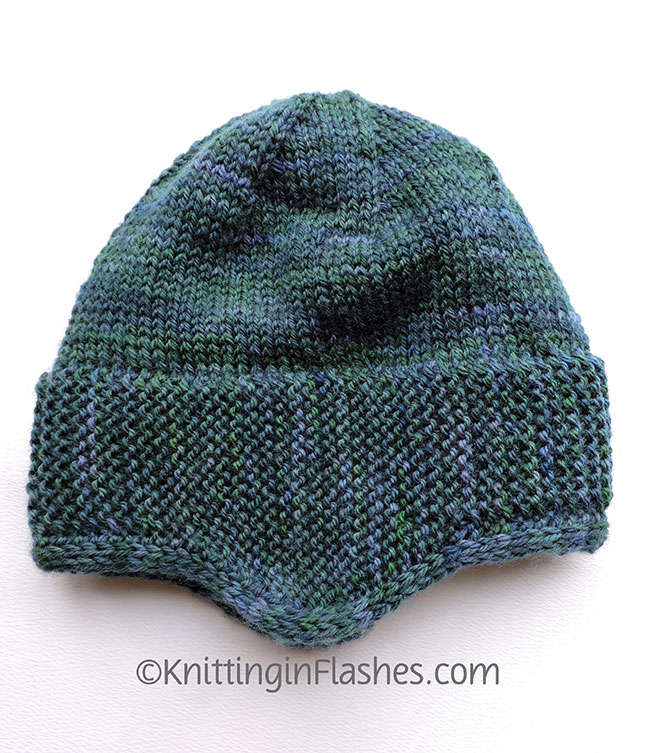 The headband part gets folded in half along a slipped stitch line. Those two edges are secured by picking up stitches from both edges for the crown thus doubling the knitting over the ears to add more warmth.
