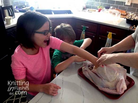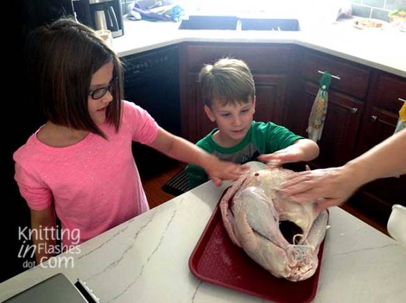 I recruited two helpers to slather butter between the skin and breast of the turkey. Smaller hands worked great.