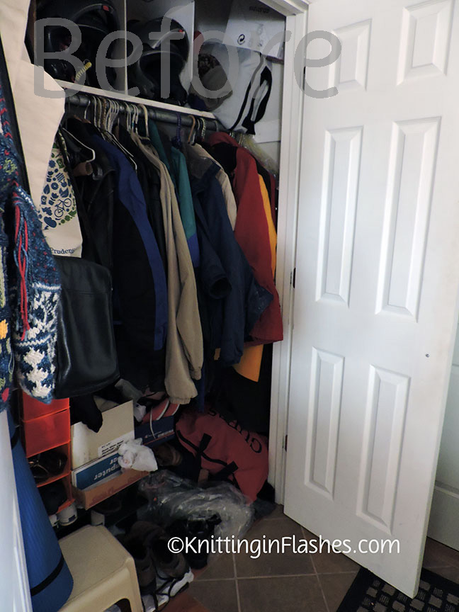 The coat closet, that is. It’s organized! I don’t want to go out on this cold, snowy day to get the finishing touches so it’s not 100% finished but it’s done enough. I’ll show you the what I’m talking about later. First the before pictures…