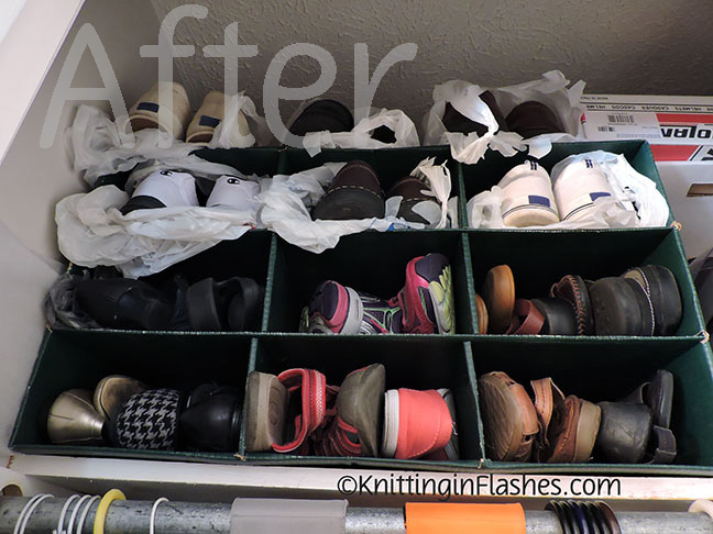 Cardboard shoe holder moved to the top shelf. One to three pairs of shoes fit in the cubbies. The plastic bags help keep the dirt and dust off the shoes. I might replace the plastic bags with fabric ones. Not a top priority right now.