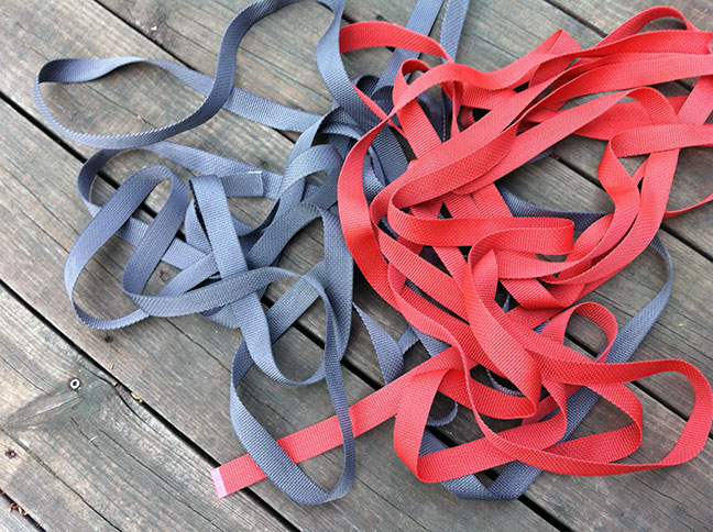 My plan to repair the seat involved cotton webbing. Only the local Joann’s store didn’t have two colors of cotton webbing so I used nylon webbing in Paprika and Steel Grey. I had two 50% off coupons and used them both.