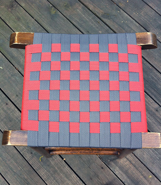 Then I attached the paprika webbing to the stool and wove the weft over and under. Over and under. Over and under. Over and under until I got to the end. Then I wrapped this piece of webbing around the rung and repeated the over and under on the bottom of the seat until all the weaving was finished. The paprika end was seared and stapled.