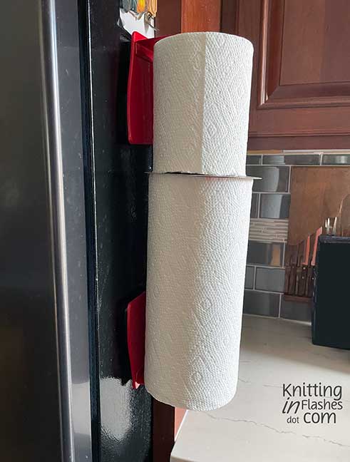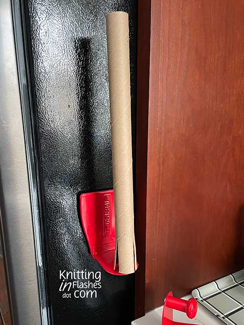 I used some bone printed fabric I got from my BFF. it’s easy to refill with the zipper opening. The open space on the bottom is where the roll of bags can be pulled out as seen below.