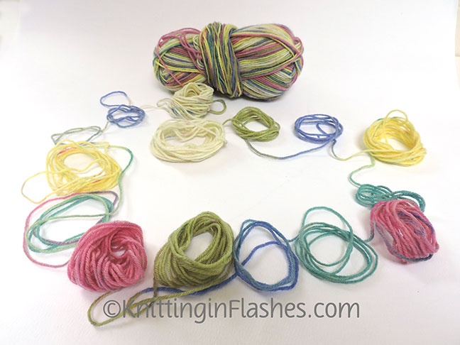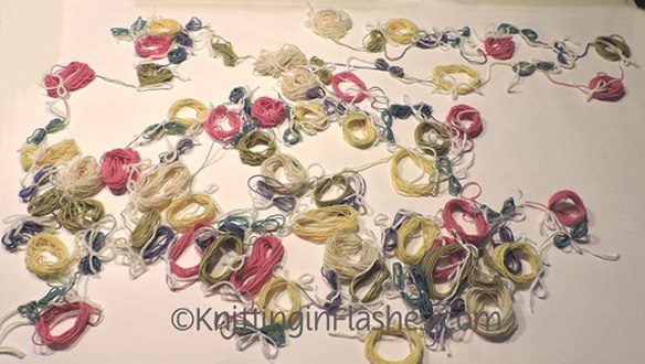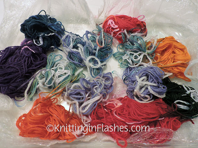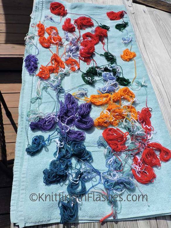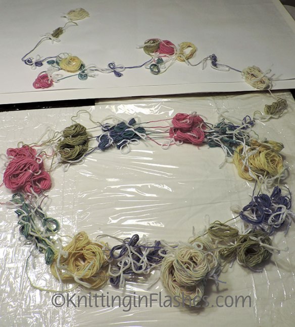 I laid out the yarn in a circle on the prepared dying surface to keep like colors together and decide what sections to dye.
