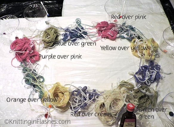 Since this is my first experience with over-dying anything, I over-dyed similar colors to the original. Purple over pink, blue over green, red over pink, yellow over yellow, green over green red over cream, and orange over yellow. I eventually added a few drops of orange to the yellow to make it more intense.