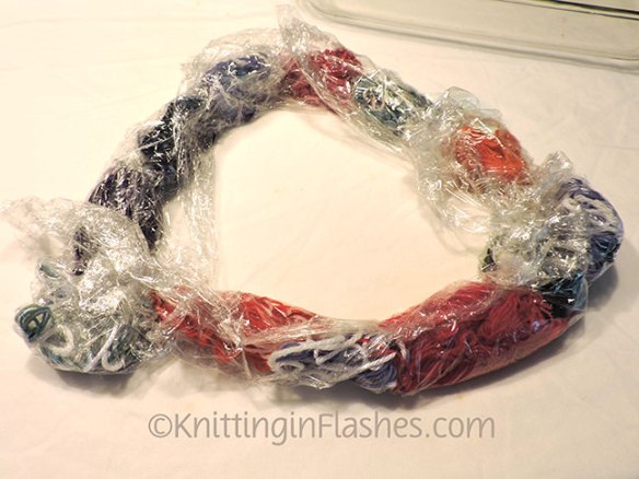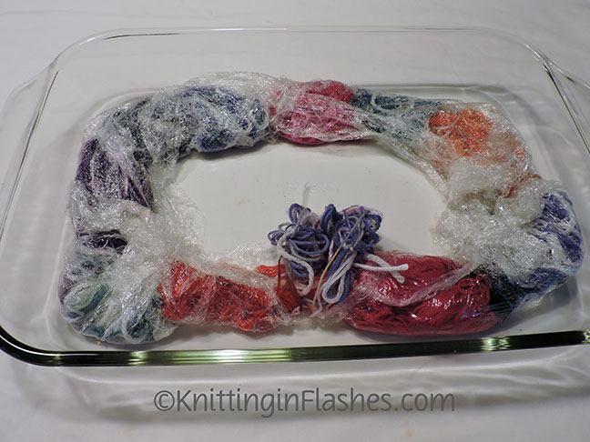 I wrapped up the yarn with the plastic and placed it in a glass microwave safe dish. Heat is necessary to set the dye.