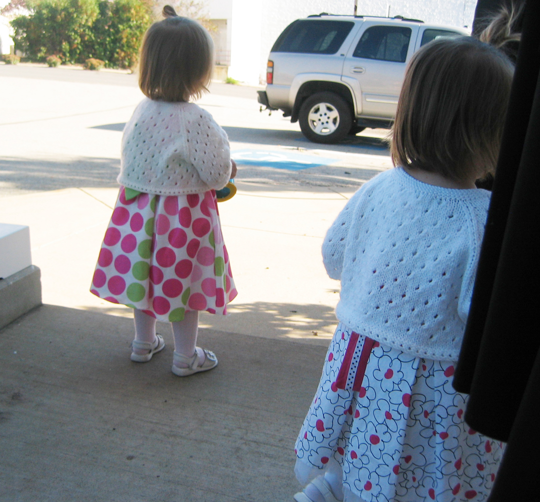 We went to a wedding over the weekend and I finally got a couple of pictures of the twins in the eyelet sweaters I made for them earlier this summer. They were both actually standing relatively still for ten seconds.