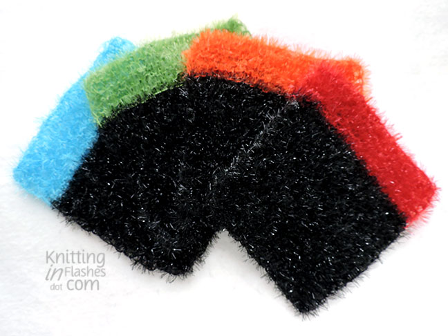 My daughter asked for more scrubbies from Red Heart Sparkle Scrubby yarn. I bought some black (Licorice) and added some colorful accents: Ice Pop, Avacado, Orange, and Strawberry.