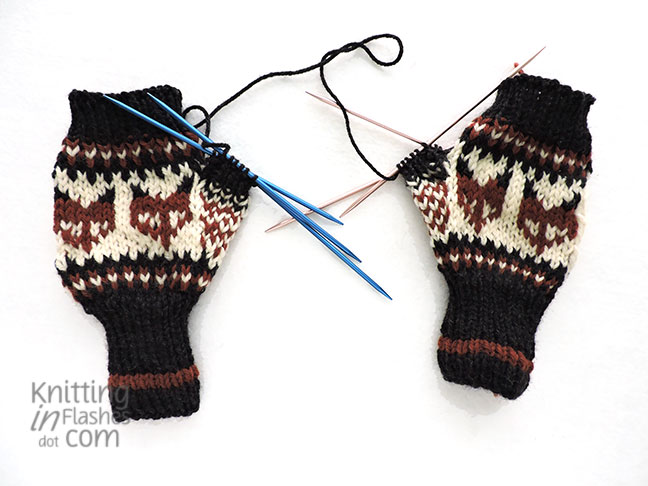After knitting the first pair, I decided to change the palm chart of the mitts to the checkerboard pattern of the thumb.