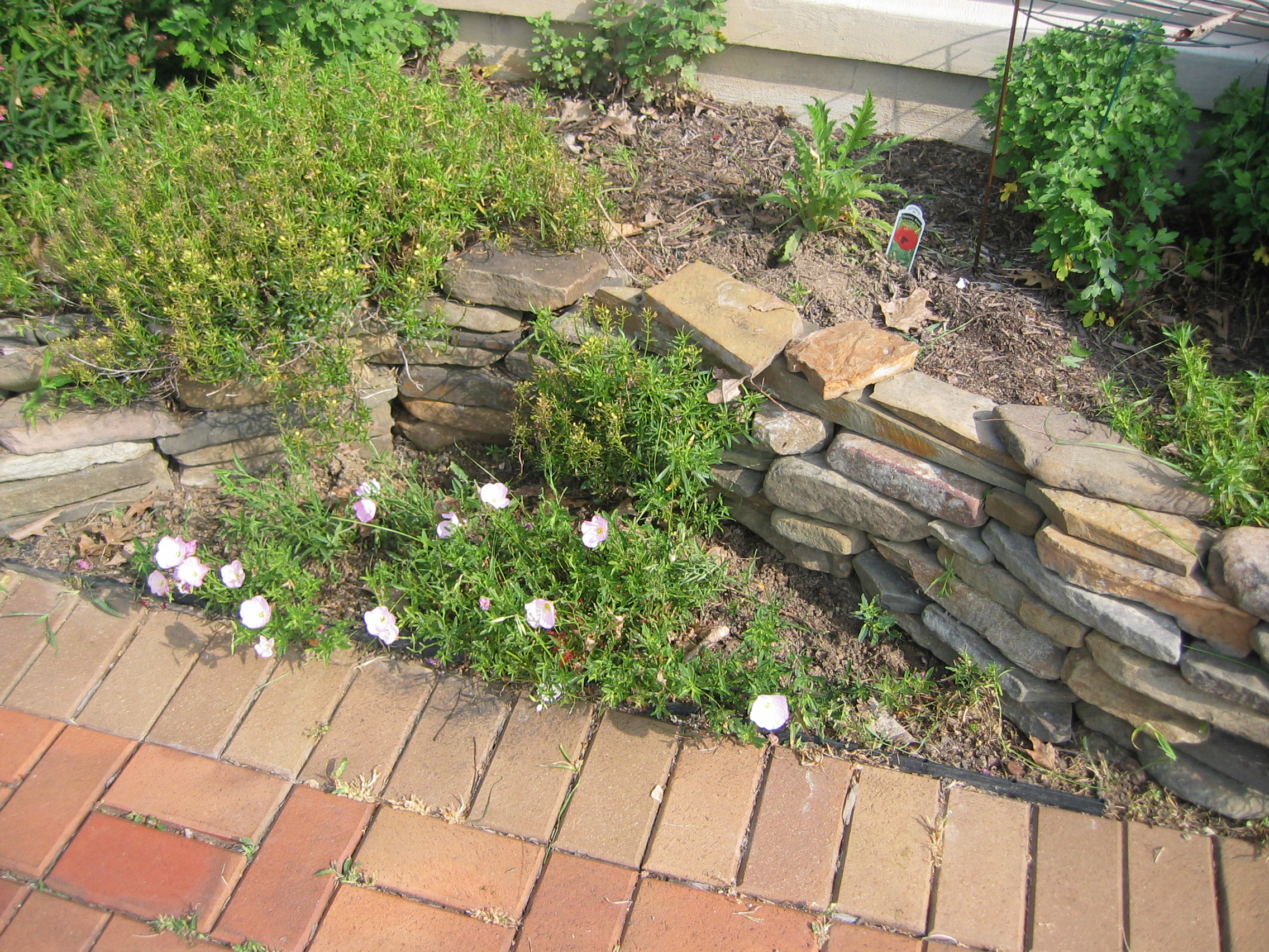 I don’t know what those pink flowers are but they love the heat from the brick sidewalk and are pretty drought resistant.