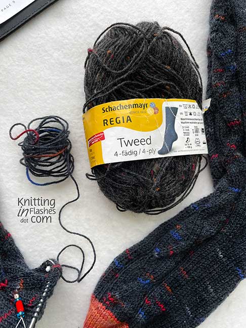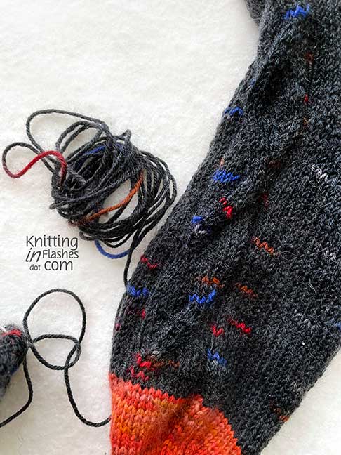 I have 18 more rows before the toe. I found another yarn in my stash from the same manufacturer and it’s going to be close enough.