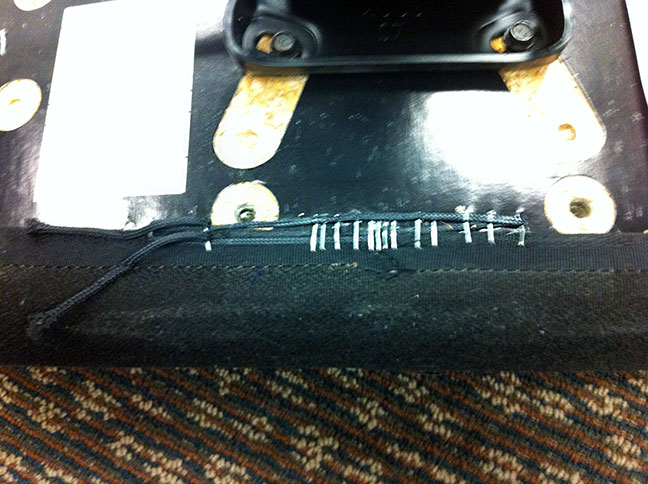 The original cover from the chair had this cool binding with a cord running through it which was sewn around the edge.  When the cord was pulled, the fabric cinched up around the frame so fewer staples were needed.