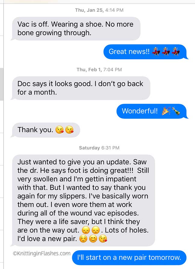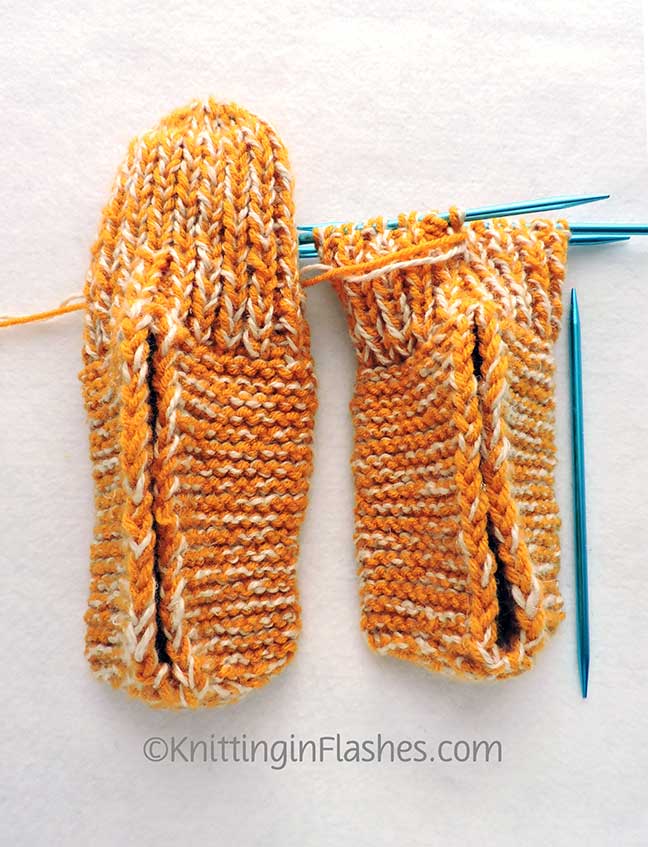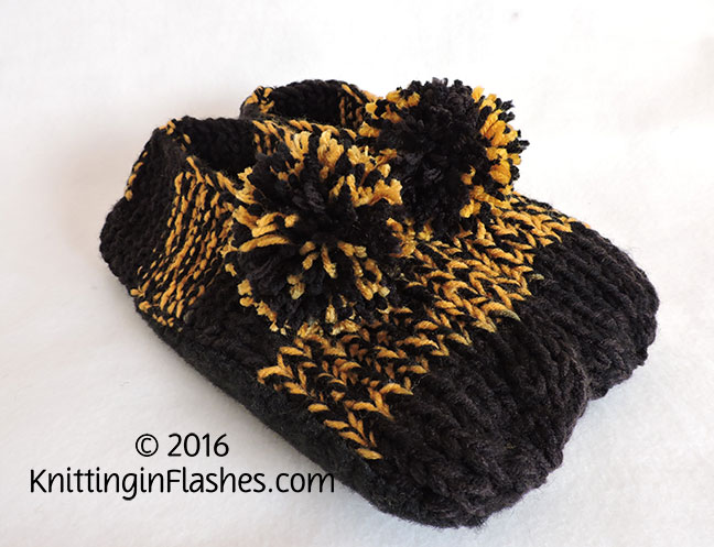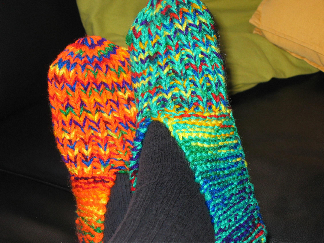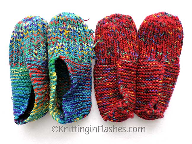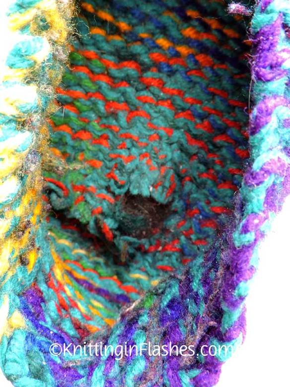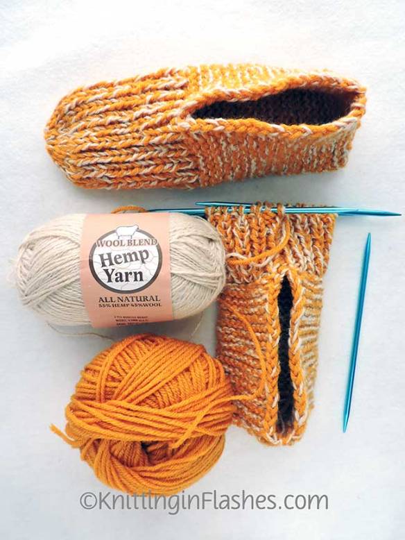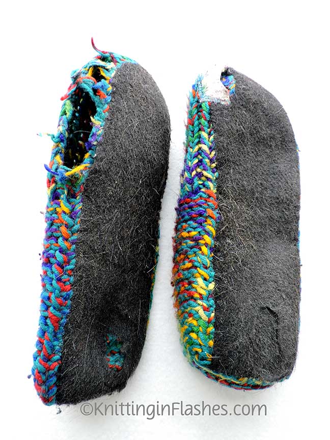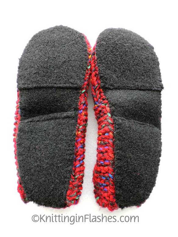 Several people have asked me about the soles. I found some “replacement carpet” for cars and trucks at Wal-Mart several years ago (2003 perhaps) when we put some new carpet in Mr. Aitch’s truck. It was easy to cut and hand sew so I tried it on the bottom of the slippers. The texture is similar to a thick felt though this is polyester. It’s good but does wear out. I bought a roll for under $10 (can’t remember the brand name) just for this purpose but I haven’t seen it at our local store for a few years. Layers of denim/old jeans, canvas or wool quilted together or even leather will also work as soles.