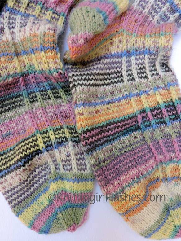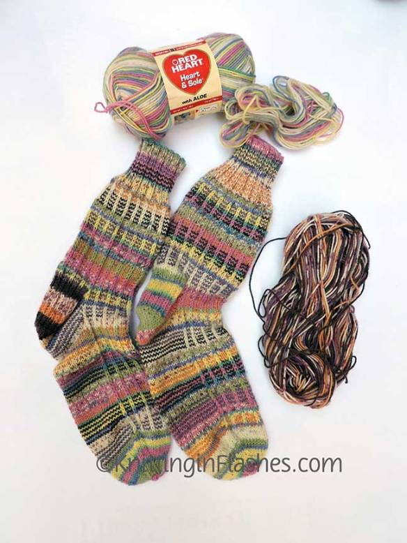 Yarns used: Soles & More in the green/blue colorway, Trekking XXL color 803 (orange/purple/brown), and Reggio exclusive self-striping yarn in primary colors #705.