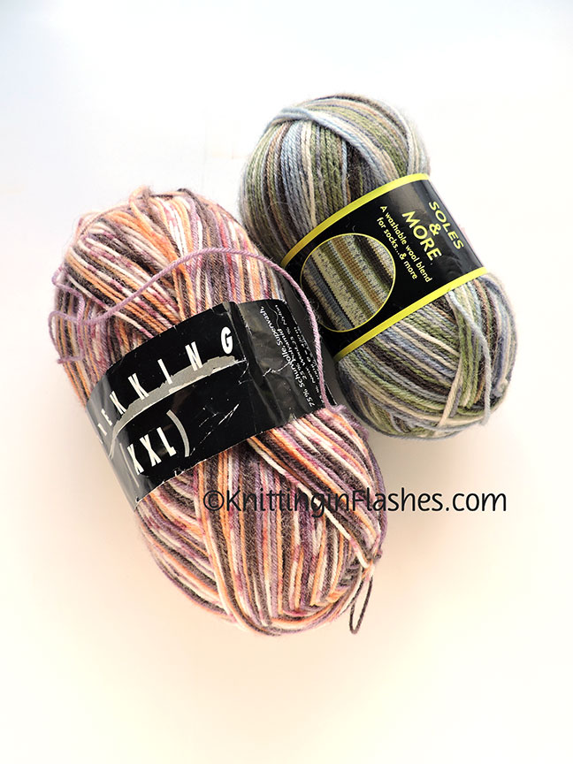 I’ve got ANOTHER pair on my needles! Using three colors: two self striping and one self-patterning. You’ve seen two of the colorways but I’ve added a different third one for this next pair.